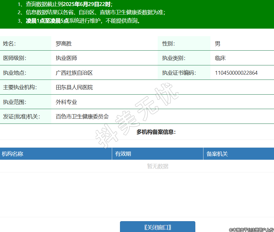 姓名:羅高勝性別:男醫(yī)師級別:執(zhí)業(yè)醫(yī)師執(zhí)業(yè)類別:臨床執(zhí)業(yè)地點:廣西壯族自治區(qū)執(zhí)業(yè)證書編碼:110450000022864主要執(zhí)業(yè)機構(gòu):田東縣人民醫(yī)院執(zhí)業(yè)范圍:外科專業(yè)發(fā)證(批準)機關(guān):百色市衛(wèi)生健康委員會 -