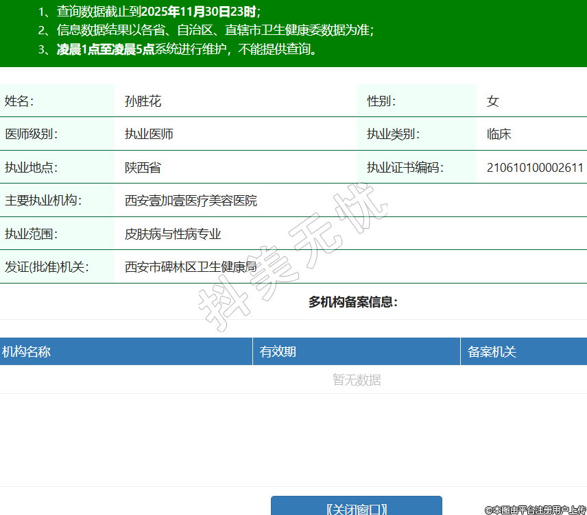姓名:孫勝花性別:女醫(yī)師級(jí)別:執(zhí)業(yè)醫(yī)師執(zhí)業(yè)類別:臨床執(zhí)業(yè)地點(diǎn):陜西省執(zhí)業(yè)證書編碼:210610100002611主要執(zhí)業(yè)機(jī)構(gòu):西安壹加壹醫(yī)療美容醫(yī)院執(zhí)業(yè)范圍:皮膚病與性病專業(yè)發(fā)證(批準(zhǔn))機(jī)關(guān):西安市碑林區(qū)衛(wèi)生健康局 -