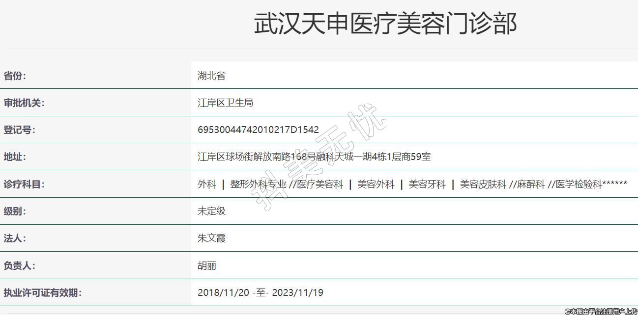 武漢天申醫(yī)療美容2019-01-08成立,地址:江岸區(qū)球場街解放南路168號融科天城一期4棟1層商59室,診療科目:外科 | 整形外科專業(yè) //醫(yī)療美容科 | 美容外科 | 美容牙科 | 美容皮膚科 //麻醉科 //醫(yī)學(xué)檢驗科******