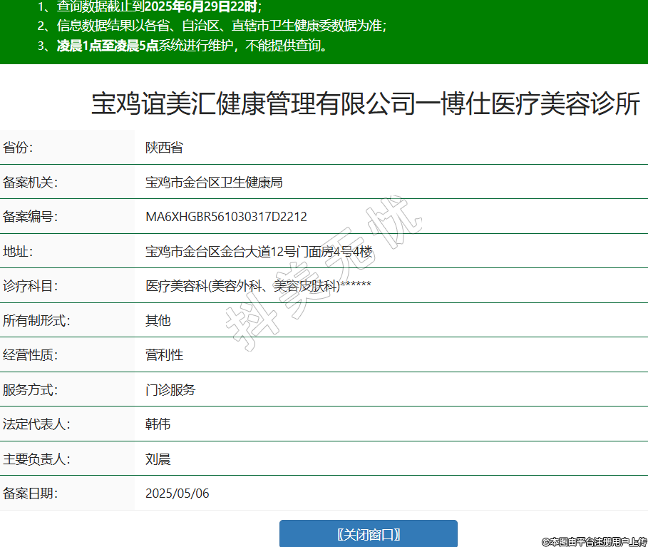 省份:陜西省備案機(jī)關(guān):寶雞市金臺(tái)區(qū)衛(wèi)生健康局備案編號(hào):MA6XHGBR561030317D2212地址:寶雞市金臺(tái)區(qū)金臺(tái)大道12號(hào)門面房4號(hào)4樓診療科目:醫(yī)療美容科(美容外科、美容皮膚科)******所有制形式:其他經(jīng)營(yíng)性質(zhì):營(yíng)利性服務(wù)方式:門診服務(wù)法定代表人:韓偉主要負(fù)責(zé)人:劉晨備案日期:2025/05/06 -