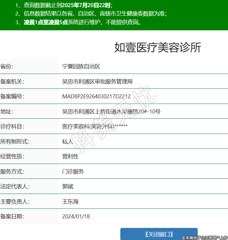 省份:寧夏回族自治區(qū)備案機關(guān):吳忠市利通區(qū)審批服務(wù)管理局備案編號:MAD8P2E9264030217D2212地址:吳忠市利通區(qū)上橋街道水岸康橋20#-10號診療科目:醫(yī)療美容科(美容外科)******所有制形式:私人經(jīng)營性質(zhì):營利性服務(wù)方式:門診服務(wù)法定代表人:郭斌主要負責人:王東海備案日期:2024/01/18 -