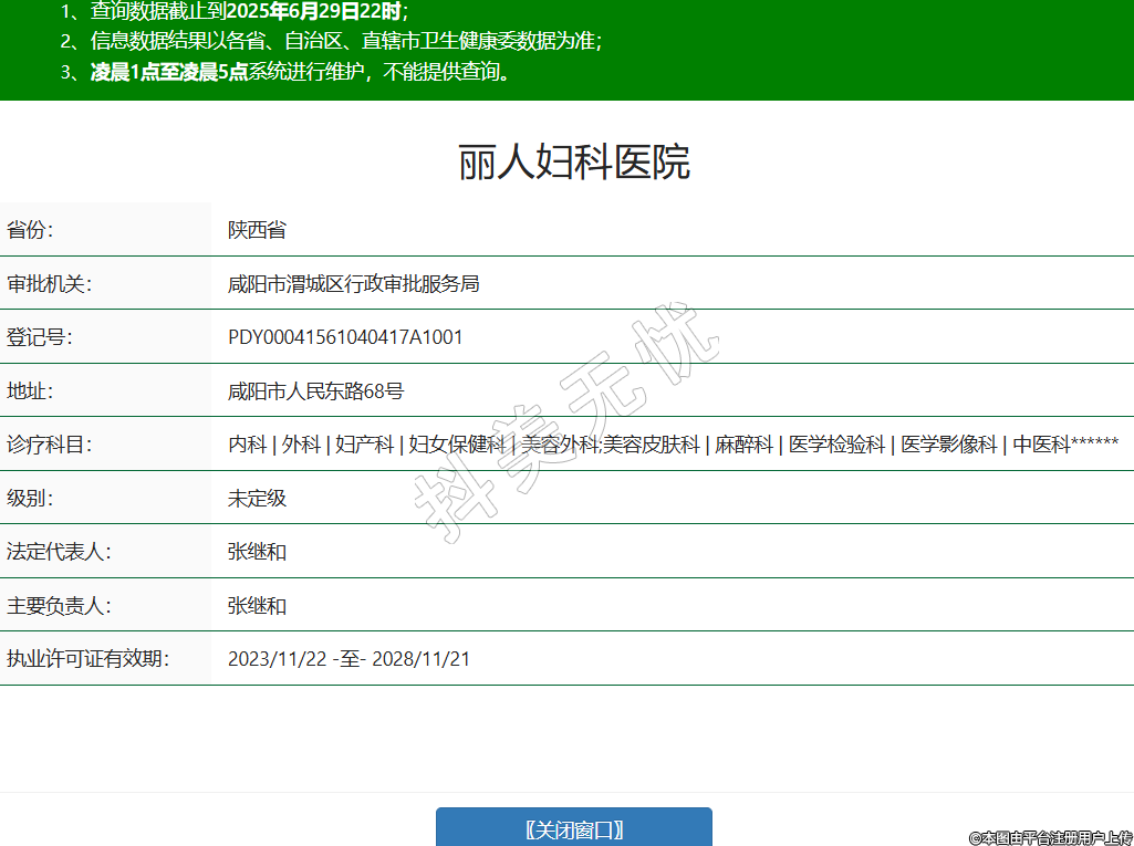 省份:陜西省審批機(jī)關(guān):咸陽(yáng)市渭城區(qū)行政審批服務(wù)局登記號(hào):PDY00041561040417A1001地址:咸陽(yáng)市人民東路68號(hào)診療科目:內(nèi)科 | 外科 | 婦產(chǎn)科 | 婦女保健科 | 美容外科;美容皮膚科 | 麻醉科 | 醫(yī)學(xué)檢驗(yàn)科 | 醫(yī)學(xué)影像科 | 中醫(yī)科******級(jí)別:未定級(jí)法定代表人:張繼和主要負(fù)責(zé)人:張繼和執(zhí)業(yè)許可證有效期:2023/11/22 -至- 2028/11/21 -