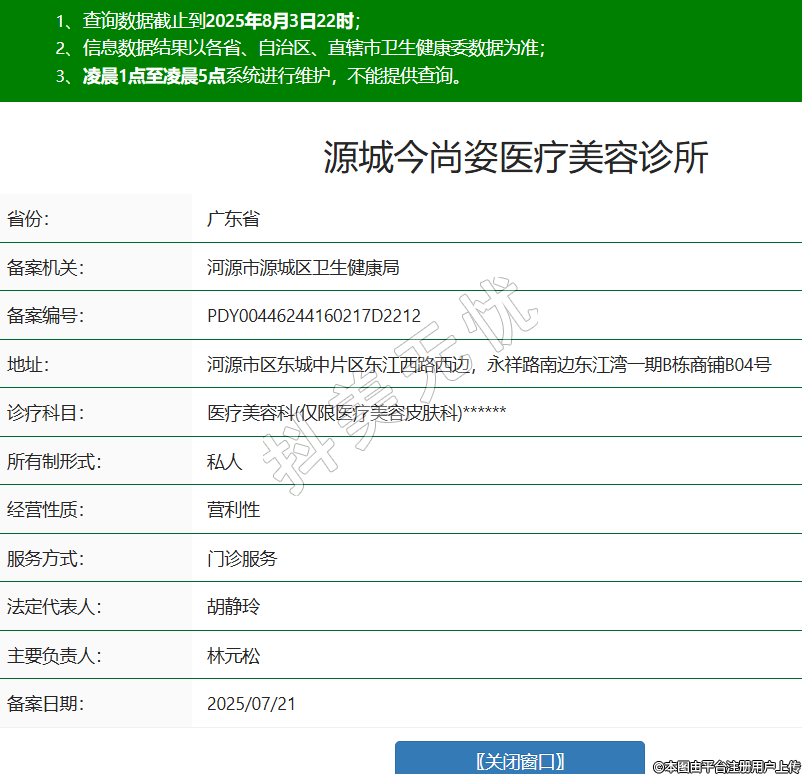 省份:廣東省備案機關:河源市源城區(qū)衛(wèi)生健康局備案編號:PDY00446244160217D2212地址:河源市區(qū)東城中片區(qū)東江西路西邊,永祥路南邊東江灣一期B棟商鋪B04號診療科目:醫(yī)療美容科(僅限醫(yī)療美容皮膚科)******所有制形式:私人經(jīng)營性質(zhì):營利性服務方式:門診服務法定代表人:胡靜玲主要負責人:林元松備案日期:2025/07/21 -