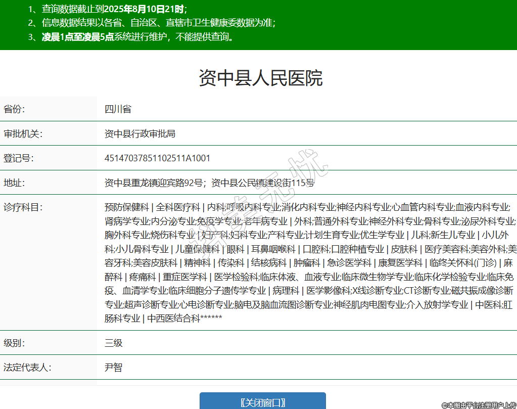 省份:四川省審批機關(guān):資中縣行政審批局登記號:45147037851102511A1001地址:資中縣重龍鎮(zhèn)迎賓路92號;資中縣公民鎮(zhèn)建設(shè)街115號診療科目:預(yù)防保健科 | 全科醫(yī)療科 | 內(nèi)科;呼吸內(nèi)科專業(yè);消化內(nèi)科專業(yè);神經(jīng)內(nèi)科專業(yè);心血管內(nèi)科專業(yè);血液內(nèi)科專業(yè);腎病學(xué)專業(yè);內(nèi)分泌專業(yè);免疫學(xué)專業(yè);老年病專業(yè) | 外科;普通外科專業(yè);神經(jīng)外科專業(yè);骨科專業(yè);泌尿外科專業(yè);胸外科專業(yè);燒傷科專業(yè) | 婦產(chǎn)科;婦科專業(yè);產(chǎn)科專業(yè);計劃生育專業(yè);優(yōu)生學(xué)專業(yè) | 兒科;新生兒專業(yè) | 小兒外科;小兒骨科專業(yè) | 兒童保健科 | 眼科 | 耳鼻咽喉科 | 口腔科;口腔種植專業(yè) | 皮膚科 | 醫(yī)療美容科;美容外科;美容牙科;美容皮膚科 | 精神科 | 傳染科 | 結(jié)核病科 | 腫瘤科 | 急診醫(yī)學(xué)科 | 康復(fù)醫(yī)學(xué)科 | 臨終關(guān)懷科(門診) | 麻醉科 | 疼痛科 | 重癥醫(yī)學(xué)科 | 醫(yī)學(xué)檢驗科;臨床體液、血液專業(yè);臨床微生物學(xué)專業(yè);臨床化學(xué)檢驗專業(yè);臨床免疫、血清學(xué)專業(yè);臨床細(xì)胞分子遺傳學(xué)專業(yè) | 病理科 | 醫(yī)學(xué)影像科;X線診斷專業(yè);CT診斷專業(yè);磁共振成像診斷專業(yè);超聲診斷專業(yè);心電診斷專業(yè);腦電及腦血流圖診斷專業(yè);神經(jīng)肌肉電圖專業(yè);介入放射學(xué)專業(yè) | 中醫(yī)科;肛腸科專業(yè) | 中西醫(yī)結(jié)合科******級別:三級法定代表人:尹智主要負(fù)責(zé)人:尹智執(zhí)業(yè)許可證有效期:2025/07/28 -至- 2030/12/31 -