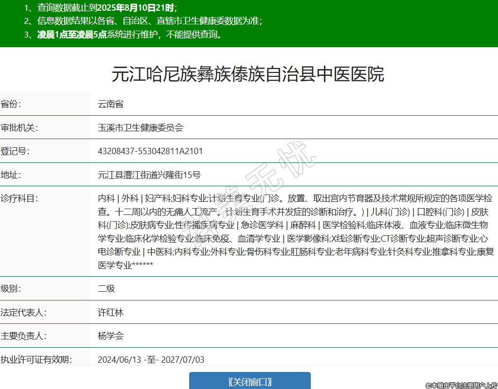 省份:云南省審批機(jī)關(guān):玉溪市衛(wèi)生健康委員會登記號:43208437-553042811A2101地址:元江縣澧江街道興隆街15號診療科目:內(nèi)科 | 外科 | 婦產(chǎn)科;婦科專業(yè);計(jì)劃生育專業(yè)(門診。放置、取出宮內(nèi)節(jié)育器及技術(shù)常規(guī)所規(guī)定的各項(xiàng)醫(yī)學(xué)檢查。十二周以內(nèi)的無痛人工流產(chǎn)。計(jì)劃生育手術(shù)并發(fā)癥的診斷和治療。) | 兒科(門診) | 口腔科(門診) | 皮膚科(門診);皮膚病專業(yè);性傳播疾病專業(yè) | 急診醫(yī)學(xué)科 | 麻醉科 | 醫(yī)學(xué)檢驗(yàn)科;臨床體液、血液專業(yè);臨床微生物學(xué)專業(yè);臨床化學(xué)檢驗(yàn)專業(yè);臨床免疫、血清學(xué)專業(yè) | 醫(yī)學(xué)影像科;X線診斷專業(yè);CT診斷專業(yè);超聲診斷專業(yè);心電診斷專業(yè) | 中醫(yī)科;內(nèi)科專業(yè);外科專業(yè);骨傷科專業(yè);肛腸科專業(yè);老年病科專業(yè);針灸科專業(yè);推拿科專業(yè);康復(fù)醫(yī)學(xué)專業(yè)******級別:二級法定代表人:許紅林主要負(fù)責(zé)人:楊學(xué)會執(zhí)業(yè)許可證有效期:2024/06/13 -至- 2027/07/03 -