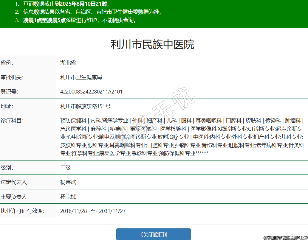省份:湖北省審批機關:利川市衛(wèi)生健康局登記號:42200085242280211A2101地址:利川市解放東路151號診療科目:預防保健科 | 內(nèi)科;腎病學專業(yè) | 外科 | 婦產(chǎn)科 | 兒科 | 眼科 | 耳鼻咽喉科 | 口腔科 | 皮膚科 | 傳染科 | 腫瘤科 | 急診醫(yī)學科 | 麻醉科 | 疼痛科 | 重癥醫(yī)學科 | 醫(yī)學檢驗科 | 醫(yī)學影像科;X線診斷專業(yè);CT診斷專業(yè);超聲診斷專業(yè);心電診斷專業(yè);腦電及腦血流圖診斷專業(yè);放射治療專業(yè) | 中醫(yī)科;內(nèi)科專業(yè);外科專業(yè);婦產(chǎn)科專業(yè);兒科專業(yè);皮膚科專業(yè);眼科專業(yè);耳鼻咽喉科專業(yè);口腔科專業(yè);腫瘤科專業(yè);骨傷科專業(yè);肛腸科專業(yè);老年病科專業(yè);針灸科專業(yè);推拿科專業(yè);康復醫(yī)學專業(yè);急診科專業(yè);預防保健科專業(yè)******級別:三級法定代表人:楊宗斌主要負責人:楊宗斌執(zhí)業(yè)許可證有效期:2016/11/28 -至- 2031/11/27 -