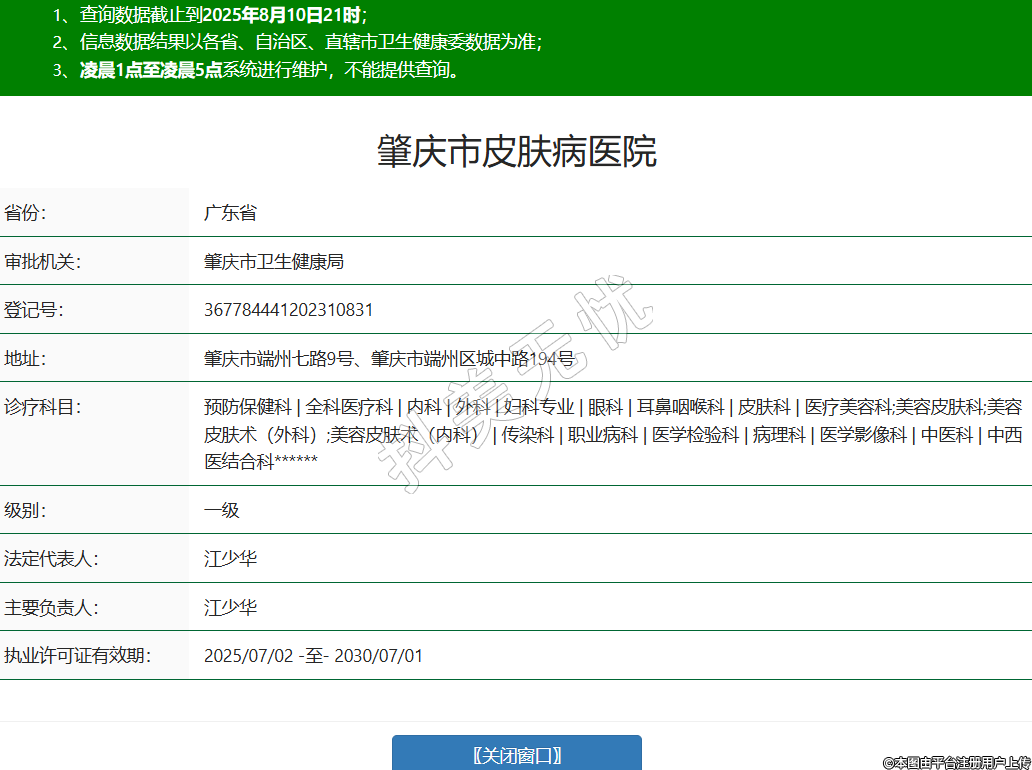 省份:廣東省審批機(jī)關(guān):肇慶市衛(wèi)生健康局登記號(hào):367784441202310831地址:肇慶市端州七路9號(hào)、肇慶市端州區(qū)城中路194號(hào)診療科目:預(yù)防保健科 | 全科醫(yī)療科 | 內(nèi)科 | 外科 | 婦科專業(yè) | 眼科 | 耳鼻咽喉科 | 皮膚科 | 醫(yī)療美容科;美容皮膚科;美容皮膚術(shù)(外科);美容皮膚術(shù)(內(nèi)科) | 傳染科 | 職業(yè)病科 | 醫(yī)學(xué)檢驗(yàn)科 | 病理科 | 醫(yī)學(xué)影像科 | 中醫(yī)科 | 中西醫(yī)結(jié)合科******級別:一級法定代表人:江少華主要負(fù)責(zé)人:江少華執(zhí)業(yè)許可證有效期:2025/07/02 -至- 2030/07/01 -