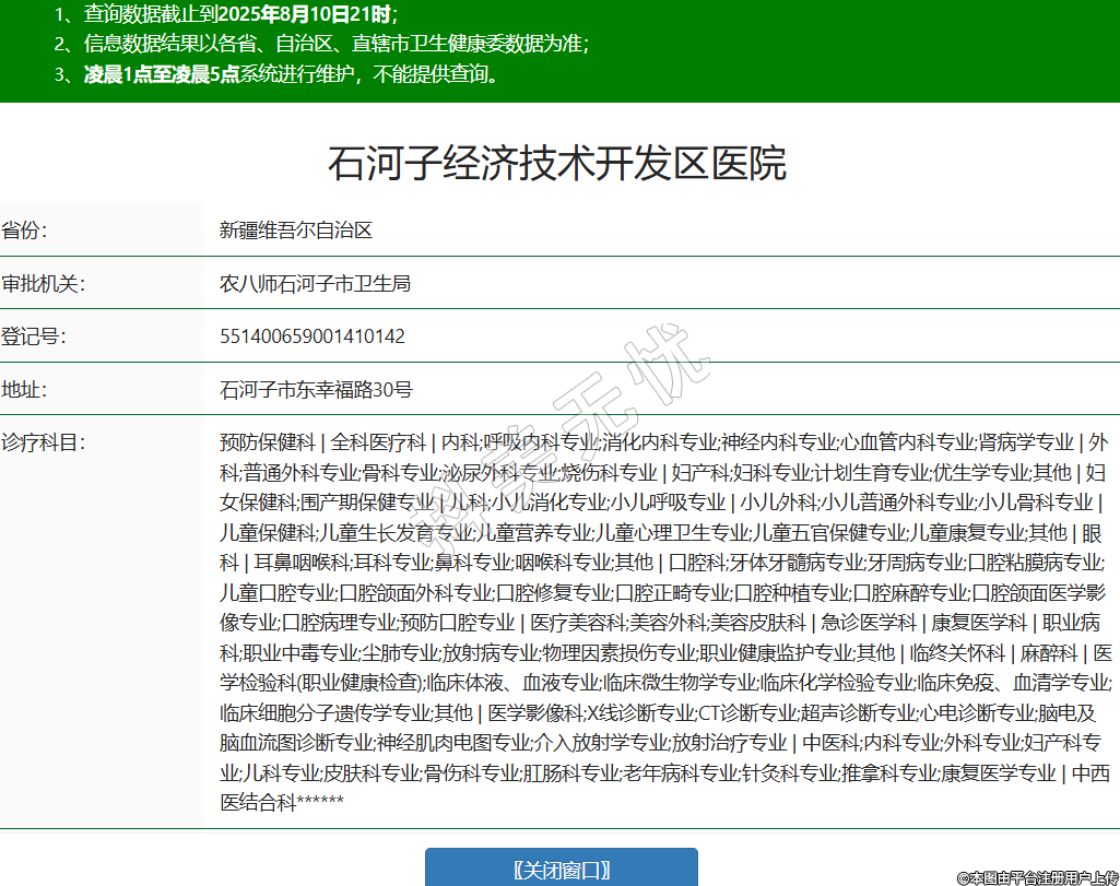省份:新疆維吾爾自治區(qū)審批機(jī)關(guān):農(nóng)八師石河子市衛(wèi)生局登記號:551400659001410142地址:石河子市東幸福路30號診療科目:預(yù)防保健科 | 全科醫(yī)療科 | 內(nèi)科;呼吸內(nèi)科專業(yè);消化內(nèi)科專業(yè);神經(jīng)內(nèi)科專業(yè);心血管內(nèi)科專業(yè);腎病學(xué)專業(yè) | 外科;普通外科專業(yè);骨科專業(yè);泌尿外科專業(yè);燒傷科專業(yè) | 婦產(chǎn)科;婦科專業(yè);計劃生育專業(yè);優(yōu)生學(xué)專業(yè);其他 | 婦女保健科;圍產(chǎn)期保健專業(yè) | 兒科;小兒消化專業(yè);小兒呼吸專業(yè) | 小兒外科;小兒普通外科專業(yè);小兒骨科專業(yè) | 兒童保健科;兒童生長發(fā)育專業(yè);兒童營養(yǎng)專業(yè);兒童心理衛(wèi)生專業(yè);兒童五官保健專業(yè);兒童康復(fù)專業(yè);其他 | 眼科 | 耳鼻咽喉科;耳科專業(yè);鼻科專業(yè);咽喉科專業(yè);其他 | 口腔科;牙體牙髓病專業(yè);牙周病專業(yè);口腔粘膜病專業(yè);兒童口腔專業(yè);口腔頜面外科專業(yè);口腔修復(fù)專業(yè);口腔正畸專業(yè);口腔種植專業(yè);口腔麻醉專業(yè);口腔頜面醫(yī)學(xué)影像專業(yè);口腔病理專業(yè);預(yù)防口腔專業(yè) | 醫(yī)療美容科;美容外科;美容皮膚科 | 急診醫(yī)學(xué)科 | 康復(fù)醫(yī)學(xué)科 | 職業(yè)病科;職業(yè)中毒專業(yè);塵肺專業(yè);放射病專業(yè);物理因素?fù)p傷專業(yè);職業(yè)健康監(jiān)護(hù)專業(yè);其他 | 臨終關(guān)懷科 | 麻醉科 | 醫(yī)學(xué)檢驗科(職業(yè)健康檢查);臨床體液、血液專業(yè);臨床微生物學(xué)專業(yè);臨床化學(xué)檢驗專業(yè);臨床免疫、血清學(xué)專業(yè);臨床細(xì)胞分子遺傳學(xué)專業(yè);其他 | 醫(yī)學(xué)影像科;X線診斷專業(yè);CT診斷專業(yè);超聲診斷專業(yè);心電診斷專業(yè);腦電及腦血流圖診斷專業(yè);神經(jīng)肌肉電圖專業(yè);介入放射學(xué)專業(yè);放射治療專業(yè) | 中醫(yī)科;內(nèi)科專業(yè);外科專業(yè);婦產(chǎn)科專業(yè);兒科專業(yè);皮膚科專業(yè);骨傷科專業(yè);肛腸科專業(yè);老年病科專業(yè);針灸科專業(yè);推拿科專業(yè);康復(fù)醫(yī)學(xué)專業(yè) | 中西醫(yī)結(jié)合科******級別:二級法定代表人:王彥主要負(fù)責(zé)人:王彥執(zhí)業(yè)許可證有效期:2021/08/10 -至- 2027/08/09 -