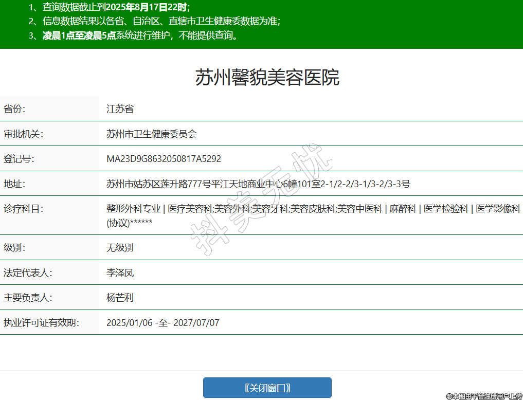 省份:江蘇省審批機(jī)關(guān):蘇州市衛(wèi)生健康委員會登記號:MA23D9G8632050817A5292地址:蘇州市姑蘇區(qū)蓮升路777號平江天地商業(yè)中心6幢101室2-1/2-2/3-1/3-2/3-3號診療科目:整形外科專業(yè) | 醫(yī)療美容科;美容外科;美容牙科;美容皮膚科;美容中醫(yī)科 | 麻醉科 | 醫(yī)學(xué)檢驗科 | 醫(yī)學(xué)影像科(協(xié)議)******級別:無級別法定代表人:李澤鳳主要負(fù)責(zé)人:楊芒利執(zhí)業(yè)許可證有效期:2025/01/06 -至- 2027/07/07 -