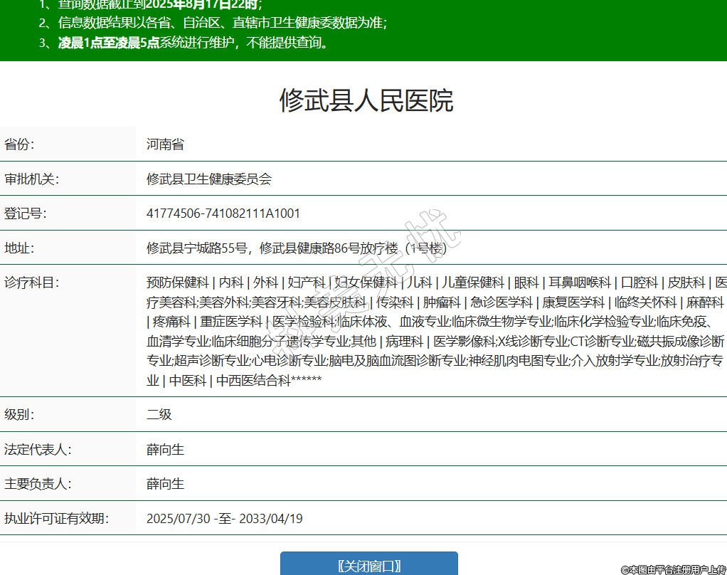 省份:河南省審批機(jī)關(guān):修武縣衛(wèi)生健康委員會(huì)登記號(hào):41774506-741082111A1001地址:修武縣寧城路55號(hào),修武縣健康路86號(hào)放療樓(1號(hào)樓)診療科目:預(yù)防保健科 | 內(nèi)科 | 外科 | 婦產(chǎn)科 | 婦女保健科 | 兒科 | 兒童保健科 | 眼科 | 耳鼻咽喉科 | 口腔科 | 皮膚科 | 醫(yī)療美容科;美容外科;美容牙科;美容皮膚科 | 傳染科 | 腫瘤科 | 急診醫(yī)學(xué)科 | 康復(fù)醫(yī)學(xué)科 | 臨終關(guān)懷科 | 麻醉科 | 疼痛科 | 重癥醫(yī)學(xué)科 | 醫(yī)學(xué)檢驗(yàn)科;臨床體液、血液專業(yè);臨床微生物學(xué)專業(yè);臨床化學(xué)檢驗(yàn)專業(yè);臨床免疫、血清學(xué)專業(yè);臨床細(xì)胞分子遺傳學(xué)專業(yè);其他 | 病理科 | 醫(yī)學(xué)影像科;X線診斷專業(yè);CT診斷專業(yè);磁共振成像診斷專業(yè);超聲診斷專業(yè);心電診斷專業(yè);腦電及腦血流圖診斷專業(yè);神經(jīng)肌肉電圖專業(yè);介入放射學(xué)專業(yè);放射治療專業(yè) | 中醫(yī)科 | 中西醫(yī)結(jié)合科******級別:二級法定代表人:薛向生主要負(fù)責(zé)人:薛向生執(zhí)業(yè)許可證有效期:2025/07/30 -至- 2033/04/19 -