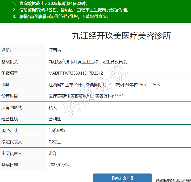 省份:江西省備案機(jī)關(guān):九江經(jīng)濟(jì)技術(shù)開發(fā)區(qū)衛(wèi)生和計劃生育委員會備案編號:MADPPTWR336041317D2212地址:江西省九江市經(jīng)開區(qū)柴桑國際1、2、3棟不分單位1507、1508診療科目:醫(yī)療美容科(美容皮膚科、美容外科)******所有制形式:私人經(jīng)營性質(zhì):營利性服務(wù)方式:門診服務(wù)法定代表人:鄭有生主要負(fù)責(zé)人:宋洋備案日期:2025/03/24 -