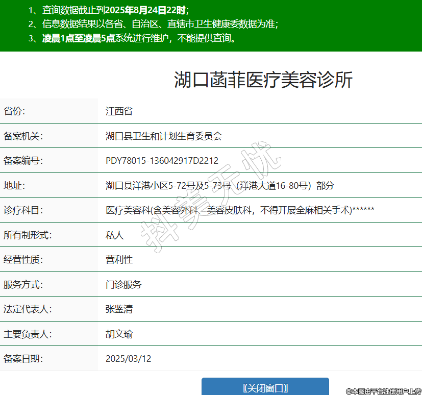 省份:江西省備案機關(guān):湖口縣衛(wèi)生和計劃生育委員會備案編號:PDY78015-136042917D2212地址:湖口縣洋港小區(qū)5-72號及5-73號(洋港大道16-80號)部分診療科目:醫(yī)療美容科(含美容外科、美容皮膚科,不得開展全麻相關(guān)手術(shù))******所有制形式:私人經(jīng)營性質(zhì):營利性服務(wù)方式:門診服務(wù)法定代表人:張鑒清主要負責(zé)人:胡文瑜備案日期:2025/03/12 -