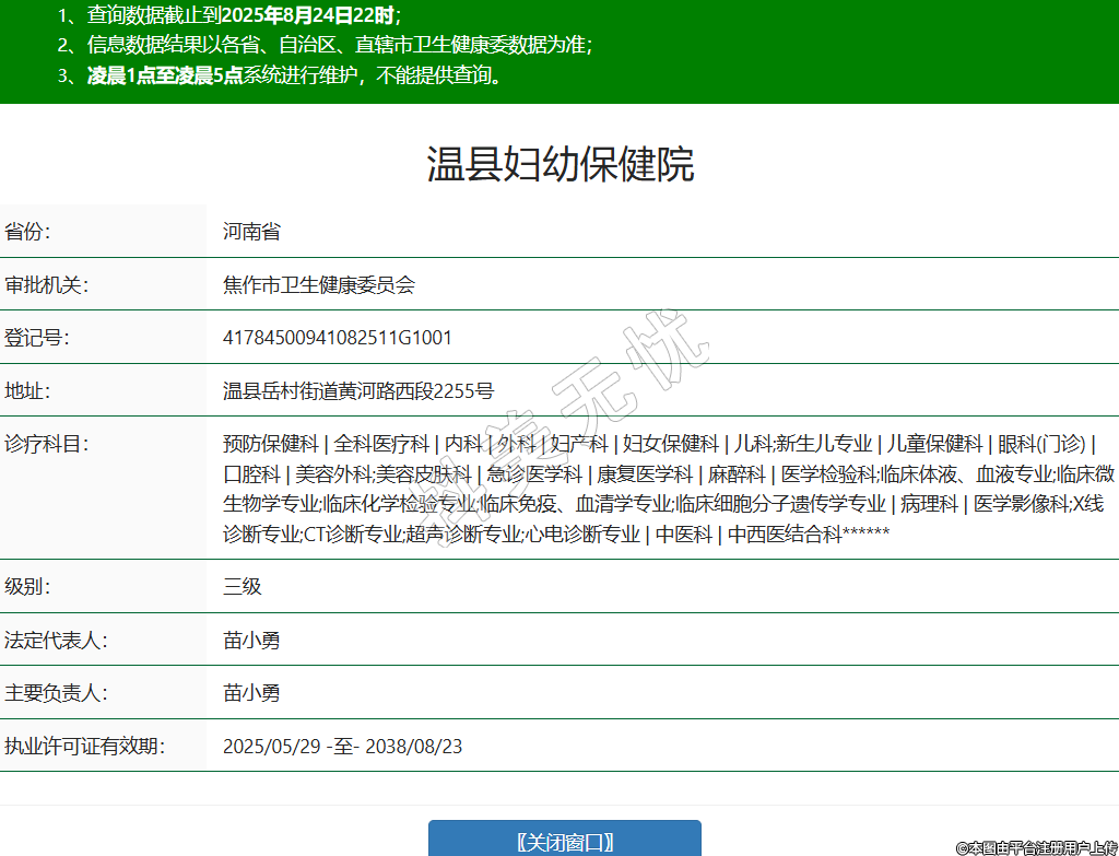 省份:河南省審批機(jī)關(guān):焦作市衛(wèi)生健康委員會登記號:41784500941082511G1001地址:溫縣岳村街道黃河路西段2255號診療科目:預(yù)防保健科 | 全科醫(yī)療科 | 內(nèi)科 | 外科 | 婦產(chǎn)科 | 婦女保健科 | 兒科;新生兒專業(yè) | 兒童保健科 | 眼科(門診) | 口腔科 | 美容外科;美容皮膚科 | 急診醫(yī)學(xué)科 | 康復(fù)醫(yī)學(xué)科 | 麻醉科 | 醫(yī)學(xué)檢驗(yàn)科;臨床體液、血液專業(yè);臨床微生物學(xué)專業(yè);臨床化學(xué)檢驗(yàn)專業(yè);臨床免疫、血清學(xué)專業(yè);臨床細(xì)胞分子遺傳學(xué)專業(yè) | 病理科 | 醫(yī)學(xué)影像科;X線診斷專業(yè);CT診斷專業(yè);超聲診斷專業(yè);心電診斷專業(yè) | 中醫(yī)科 | 中西醫(yī)結(jié)合科******級別:三級法定代表人:苗小勇主要負(fù)責(zé)人:苗小勇執(zhí)業(yè)許可證有效期:2025/05/29 -至- 2038/08/23 -