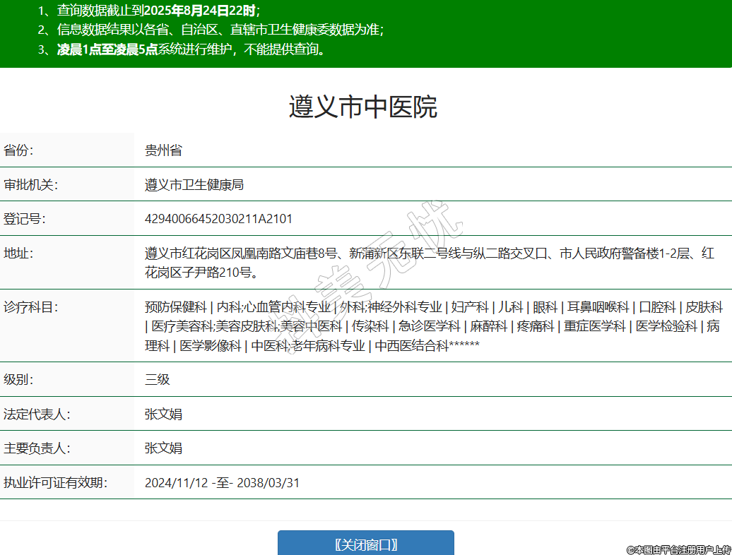 省份:貴州省審批機(jī)關(guān):遵義市衛(wèi)生健康局登記號:42940066452030211A2101地址:遵義市紅花崗區(qū)鳳凰南路文廟巷8號、新蒲新區(qū)東聯(lián)二號線與縱二路交叉口、市人民政府警備樓1-2層、紅花崗區(qū)子尹路210號。診療科目:預(yù)防保健科 | 內(nèi)科;心血管內(nèi)科專業(yè) | 外科;神經(jīng)外科專業(yè) | 婦產(chǎn)科 | 兒科 | 眼科 | 耳鼻咽喉科 | 口腔科 | 皮膚科 | 醫(yī)療美容科;美容皮膚科;美容中醫(yī)科 | 傳染科 | 急診醫(yī)學(xué)科 | 麻醉科 | 疼痛科 | 重癥醫(yī)學(xué)科 | 醫(yī)學(xué)檢驗(yàn)科 | 病理科 | 醫(yī)學(xué)影像科 | 中醫(yī)科;老年病科專業(yè) | 中西醫(yī)結(jié)合科******級別:三級法定代表人:張文娟主要負(fù)責(zé)人:張文娟執(zhí)業(yè)許可證有效期:2024/11/12 -至- 2038/03/31 -