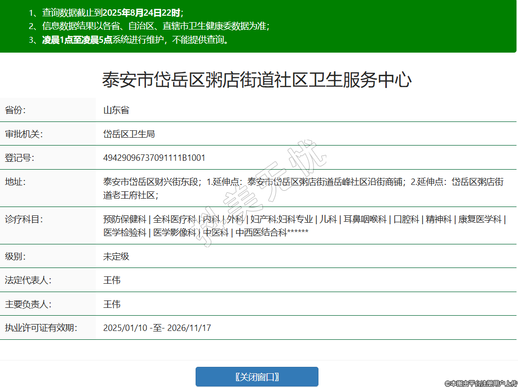 省份:山東省審批機關(guān):岱岳區(qū)衛(wèi)生局登記號:49429096737091111B1001地址:泰安市岱岳區(qū)財興街東段;1.延伸點:泰安市岱岳區(qū)粥店街道岳峰社區(qū)沿街商鋪;2.延伸點:岱岳區(qū)粥店街道老王府社區(qū);診療科目:預(yù)防保健科 | 全科醫(yī)療科 | 內(nèi)科 | 外科 | 婦產(chǎn)科;婦科專業(yè) | 兒科 | 耳鼻咽喉科 | 口腔科 | 精神科 | 康復(fù)醫(yī)學科 | 醫(yī)學檢驗科 | 醫(yī)學影像科 | 中醫(yī)科 | 中西醫(yī)結(jié)合科******級別:未定級法定代表人:王偉主要負責人:王偉執(zhí)業(yè)許可證有效期:2025/01/10 -至- 2026/11/17 -