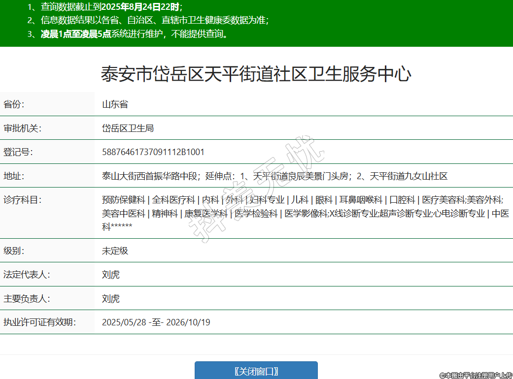 省份:山東省審批機關:岱岳區(qū)衛(wèi)生局登記號:58876461737091112B1001地址:泰山大街西首振華路中段;延伸點:1、天平街道良辰美景門頭房;2、天平街道九女山社區(qū)診療科目:預防保健科 | 全科醫(yī)療科 | 內(nèi)科 | 外科 | 婦科專業(yè) | 兒科 | 眼科 | 耳鼻咽喉科 | 口腔科 | 醫(yī)療美容科;美容外科;美容中醫(yī)科 | 精神科 | 康復醫(yī)學科 | 醫(yī)學檢驗科 | 醫(yī)學影像科;X線診斷專業(yè);超聲診斷專業(yè);心電診斷專業(yè) | 中醫(yī)科******級別:未定級法定代表人:劉虎主要負責人:劉虎執(zhí)業(yè)許可證有效期:2025/05/28 -至- 2026/10/19 -