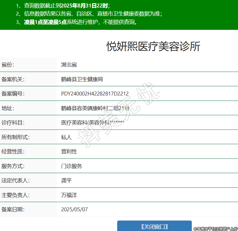 省份:湖北省備案機(jī)關(guān):鶴峰縣衛(wèi)生健康局備案編號(hào):PDY240002H42282817D2212地址:鶴峰縣容美鎮(zhèn)康嶺村二組21號(hào)診療科目:醫(yī)療美容科(美容外科)******所有制形式:私人經(jīng)營(yíng)性質(zhì):營(yíng)利性服務(wù)方式:門診服務(wù)法定代表人:龔平主要負(fù)責(zé)人:萬福洋備案日期:2025/05/07 -