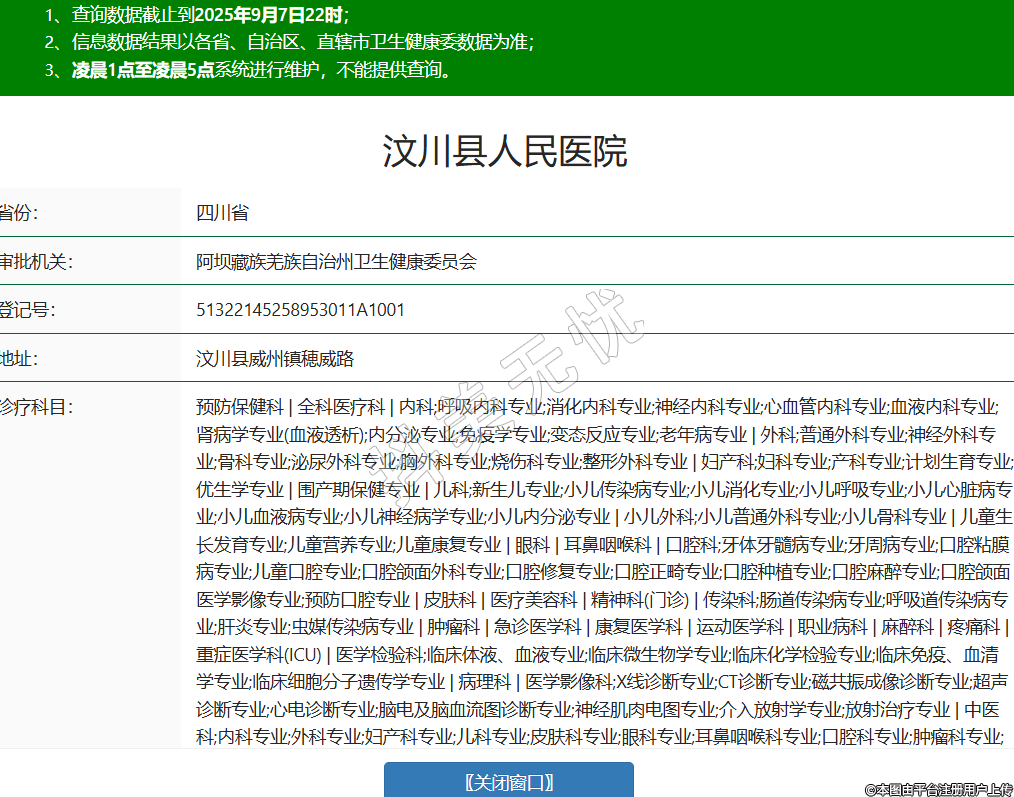 省份:四川省審批機關(guān):阿壩藏族羌族自治州衛(wèi)生健康委員會登記號:51322145258953011A1001地址:汶川縣威州鎮(zhèn)穂威路診療科目:預(yù)防保健科 | 全科醫(yī)療科 | 內(nèi)科;呼吸內(nèi)科專業(yè);消化內(nèi)科專業(yè);神經(jīng)內(nèi)科專業(yè);心血管內(nèi)科專業(yè);血液內(nèi)科專業(yè);腎病學(xué)專業(yè)(血液透析);內(nèi)分泌專業(yè);免疫學(xué)專業(yè);變態(tài)反應(yīng)專業(yè);老年病專業(yè) | 外科;普通外科專業(yè);神經(jīng)外科專業(yè);骨科專業(yè);泌尿外科專業(yè);胸外科專業(yè);燒傷科專業(yè);整形外科專業(yè) | 婦產(chǎn)科;婦科專業(yè);產(chǎn)科專業(yè);計劃生育專業(yè);優(yōu)生學(xué)專業(yè) | 圍產(chǎn)期保健專業(yè) | 兒科;新生兒專業(yè);小兒傳染病專業(yè);小兒消化專業(yè);小兒呼吸專業(yè);小兒心臟病專業(yè);小兒血液病專業(yè);小兒神經(jīng)病學(xué)專業(yè);小兒內(nèi)分泌專業(yè) | 小兒外科;小兒普通外科專業(yè);小兒骨科專業(yè) | 兒童生長發(fā)育專業(yè);兒童營養(yǎng)專業(yè);兒童康復(fù)專業(yè) | 眼科 | 耳鼻咽喉科 | 口腔科;牙體牙髓病專業(yè);牙周病專業(yè);口腔粘膜病專業(yè);兒童口腔專業(yè);口腔頜面外科專業(yè);口腔修復(fù)專業(yè);口腔正畸專業(yè);口腔種植專業(yè);口腔麻醉專業(yè);口腔頜面醫(yī)學(xué)影像專業(yè);預(yù)防口腔專業(yè) | 皮膚科 | 醫(yī)療美容科 | 精神科(門診) | 傳染科;腸道傳染病專業(yè);呼吸道傳染病專業(yè);肝炎專業(yè);蟲媒傳染病專業(yè) | 腫瘤科 | 急診醫(yī)學(xué)科 | 康復(fù)醫(yī)學(xué)科 | 運動醫(yī)學(xué)科 | 職業(yè)病科 | 麻醉科 | 疼痛科 | 重癥醫(yī)學(xué)科(ICU) | 醫(yī)學(xué)檢驗科;臨床體液、血液專業(yè);臨床微生物學(xué)專業(yè);臨床化學(xué)檢驗專業(yè);臨床免疫、血清學(xué)專業(yè);臨床細胞分子遺傳學(xué)專業(yè) | 病理科 | 醫(yī)學(xué)影像科;X線診斷專業(yè);CT診斷專業(yè);磁共振成像診斷專業(yè);超聲診斷專業(yè);心電診斷專業(yè);腦電及腦血流圖診斷專業(yè);神經(jīng)肌肉電圖專業(yè);介入放射學(xué)專業(yè);放射治療專業(yè) | 中醫(yī)科;內(nèi)科專業(yè);外科專業(yè);婦產(chǎn)科專業(yè);兒科專業(yè);皮膚科專業(yè);眼科專業(yè);耳鼻咽喉科專業(yè);口腔科專業(yè);腫瘤科專業(yè);骨傷科專業(yè);肛腸科專業(yè);老年病科專業(yè);針灸科專業(yè);推拿科專業(yè);康復(fù)醫(yī)學(xué)專業(yè);預(yù)防保健科專業(yè) | 民族醫(yī)學(xué)科 | 中西醫(yī)結(jié)合科******級別:三級法定代表人:馮盧主要負責(zé)人:馮盧執(zhí)業(yè)許可證有效期:2023/04/25 -至- 2038/04/25 -