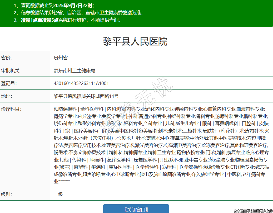省份:貴州省審批機關(guān):黔東南州衛(wèi)生健康局登記號:43016014352263111A1001地址:黎平縣德鳳鎮(zhèn)城關(guān)環(huán)城西路14號診療科目:預(yù)防保健科 | 全科醫(yī)療科 | 內(nèi)科;呼吸內(nèi)科專業(yè);消化內(nèi)科專業(yè);神經(jīng)內(nèi)科專業(yè);心血管內(nèi)科專業(yè);血液內(nèi)科專業(yè);腎病學專業(yè);內(nèi)分泌專業(yè);免疫學專業(yè) | 外科;普通外科專業(yè);神經(jīng)外科專業(yè);骨科專業(yè);泌尿外科專業(yè);胸外科專業(yè);燒傷科專業(yè);整形外科專業(yè) | 婦產(chǎn)科;婦科專業(yè);產(chǎn)科專業(yè) | 兒科;新生兒專業(yè) | 眼科 | 耳鼻咽喉科 | 口腔科 | 皮膚科(門診) | 醫(yī)療美容科(門診);美容中醫(yī)科;針灸美容;針刺術(shù);毫針術(shù);三棱針術(shù);皮膚針(梅花針)術(shù);皮內(nèi)針術(shù);火針術(shù);電針術(shù);水針(穴位注射)術(shù);炙術(shù);耳針術(shù);拔罐術(shù);中醫(yī)推拿美容;中藥外治;其他中醫(yī)美容技術(shù);穴位埋線療法;美容醫(yī)療應(yīng)用技術(shù);物理美容治療術(shù);激光美容治療術(shù);高頻電美容治療;冷凍美容治療;其他物理美容治療;脫毛術(shù);不良文飾修復(fù)技術(shù) | 精神科;精神病專業(yè);精神衛(wèi)生專業(yè);藥物依賴專業(yè)(門診);精神康復(fù)專業(yè);臨床心理專業(yè);其他 | 傳染科 | 腫瘤科 | 急診醫(yī)學科 | 康復(fù)醫(yī)學科 | 職業(yè)病科;職業(yè)中毒專業(yè)(苯);塵肺專業(yè);物理因素損傷專業(yè)(噪聲) | 麻醉科 | 疼痛科 | 重癥醫(yī)學科 | 醫(yī)學檢驗科 | 病理科 | 醫(yī)學影像科;X線診斷專業(yè);CT診斷專業(yè);磁共振成像診斷專業(yè);超聲診斷專業(yè);心電診斷專業(yè);腦電及腦血流圖診斷專業(yè);介入放射學專業(yè) | 中醫(yī)科;老年病科專業(yè)******級別:二級法定代表人:李勇主要負責人:李勇執(zhí)業(yè)許可證有效期:2025/05/12 -至- 2040/05/11 -