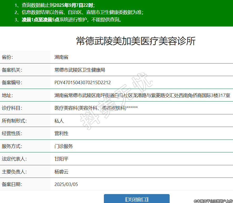 省份:湖南省備案機(jī)關(guān):常德市武陵區(qū)衛(wèi)生健康局備案編號(hào):PDY47015043070215D2212地址:湖南省常德市武陵區(qū)南坪街道白馬社區(qū)龍港路與紫菱路交匯處西南角僑商國(guó)際3樓317室診療科目:醫(yī)療美容科(美容外科、美容皮膚科)******所有制形式:私人經(jīng)營(yíng)性質(zhì):營(yíng)利性服務(wù)方式:門(mén)診服務(wù)法定代表人:甘陽(yáng)平主要負(fù)責(zé)人:楊碧云備案日期:2025/03/05 -