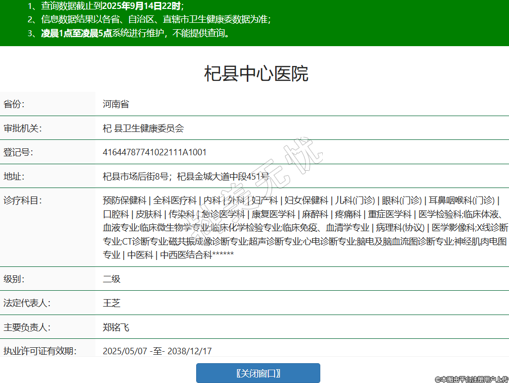 省份:河南省審批機(jī)關(guān):杞 縣衛(wèi)生健康委員會(huì)登記號(hào):41644787741022111A1001地址:杞縣市場(chǎng)后街8號(hào);杞縣金城大道中段451號(hào)診療科目:預(yù)防保健科 | 全科醫(yī)療科 | 內(nèi)科 | 外科 | 婦產(chǎn)科 | 婦女保健科 | 兒科(門診) | 眼科(門診) | 耳鼻咽喉科(門診) | 口腔科 | 皮膚科 | 傳染科 | 急診醫(yī)學(xué)科 | 康復(fù)醫(yī)學(xué)科 | 麻醉科 | 疼痛科 | 重癥醫(yī)學(xué)科 | 醫(yī)學(xué)檢驗(yàn)科;臨床體液、血液專業(yè);臨床微生物學(xué)專業(yè);臨床化學(xué)檢驗(yàn)專業(yè);臨床免疫、血清學(xué)專業(yè) | 病理科(協(xié)議) | 醫(yī)學(xué)影像科;X線診斷專業(yè);CT診斷專業(yè);磁共振成像診斷專業(yè);超聲診斷專業(yè);心電診斷專業(yè);腦電及腦血流圖診斷專業(yè);神經(jīng)肌肉電圖專業(yè) | 中醫(yī)科 | 中西醫(yī)結(jié)合科******級(jí)別:二級(jí)法定代表人:王芝主要負(fù)責(zé)人:鄭銘飛執(zhí)業(yè)許可證有效期:2025/05/07 -至- 2038/12/17 -