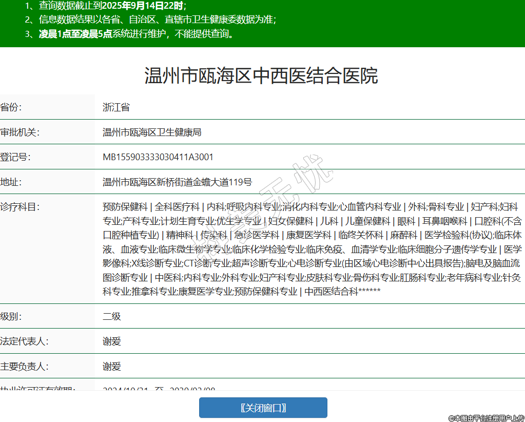 省份:浙江省審批機(jī)關(guān):溫州市甌海區(qū)衛(wèi)生健康局登記號:MB155903333030411A3001地址:溫州市甌海區(qū)新橋街道金蟾大道119號診療科目:預(yù)防保健科 | 全科醫(yī)療科 | 內(nèi)科;呼吸內(nèi)科專業(yè);消化內(nèi)科專業(yè);心血管內(nèi)科專業(yè) | 外科;骨科專業(yè) | 婦產(chǎn)科;婦科專業(yè);產(chǎn)科專業(yè);計劃生育專業(yè);優(yōu)生學(xué)專業(yè) | 婦女保健科 | 兒科 | 兒童保健科 | 眼科 | 耳鼻咽喉科 | 口腔科(不含口腔種植專業(yè)) | 精神科 | 傳染科 | 急診醫(yī)學(xué)科 | 康復(fù)醫(yī)學(xué)科 | 臨終關(guān)懷科 | 麻醉科 | 醫(yī)學(xué)檢驗(yàn)科(協(xié)議);臨床體液、血液專業(yè);臨床微生物學(xué)專業(yè);臨床化學(xué)檢驗(yàn)專業(yè);臨床免疫、血清學(xué)專業(yè);臨床細(xì)胞分子遺傳學(xué)專業(yè) | 醫(yī)學(xué)影像科;X線診斷專業(yè);CT診斷專業(yè);超聲診斷專業(yè);心電診斷專業(yè)(由區(qū)域心電診斷中心出具報告);腦電及腦血流圖診斷專業(yè) | 中醫(yī)科;內(nèi)科專業(yè);外科專業(yè);婦產(chǎn)科專業(yè);皮膚科專業(yè);骨傷科專業(yè);肛腸科專業(yè);老年病科專業(yè);針灸科專業(yè);推拿科專業(yè);康復(fù)醫(yī)學(xué)專業(yè);預(yù)防保健科專業(yè) | 中西醫(yī)結(jié)合科******級別:二級法定代表人:謝愛主要負(fù)責(zé)人:謝愛執(zhí)業(yè)許可證有效期:2024/10/31 -至- 2030/03/08 -