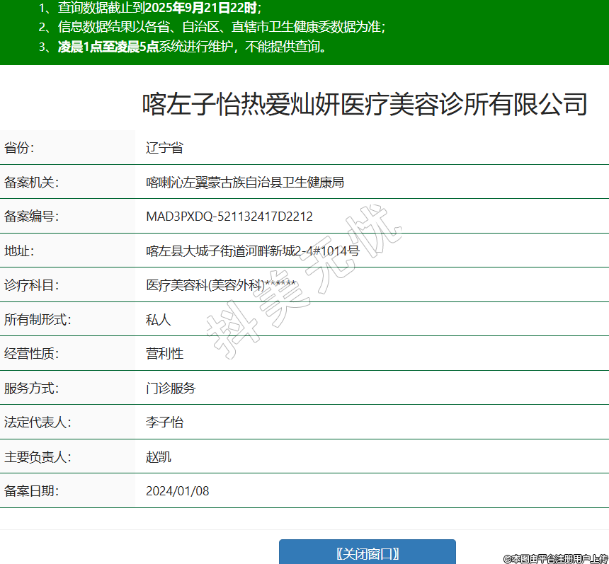 省份:遼寧省備案機(jī)關(guān):喀喇沁左翼蒙古族自治縣衛(wèi)生健康局備案編號(hào):MAD3PXDQ-521132417D2212地址:喀左縣大城子街道河畔新城2-4#1014號(hào)診療科目:醫(yī)療美容科(美容外科)******所有制形式:私人經(jīng)營(yíng)性質(zhì):營(yíng)利性服務(wù)方式:門診服務(wù)法定代表人:李子怡主要負(fù)責(zé)人:趙凱備案日期:2024/01/08 -