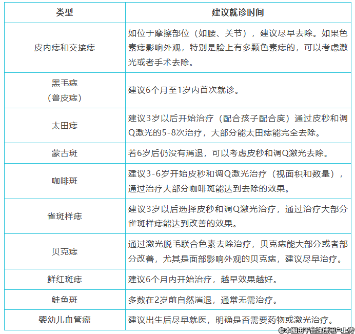 多數(shù)色斑、胎記不會影響寶寶的身體健康,但是特別是發(fā)生在顏面部的胎記,可能會影響寶寶的成長過程中的社交。所以如果寶寶臉上出現(xiàn)異常的色素斑塊,持續(xù)一個(gè)月以上不消退,建議積極就診。特別是需要盡早干預(yù)的胎記,千萬不要錯過它們的黃金治療期哦。